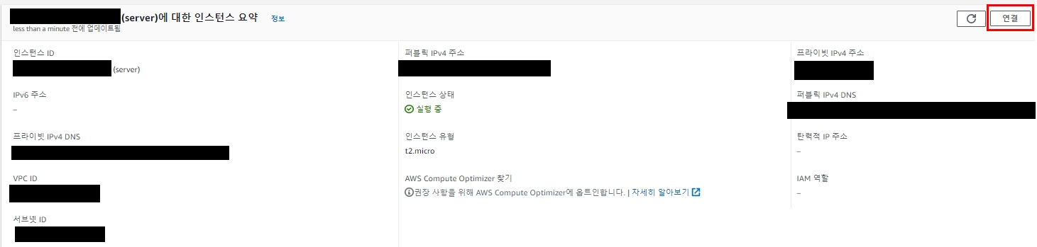 1. EC2를 생성했으면 EC2의 정보에 들어가 연결 버튼을 누릅니다.