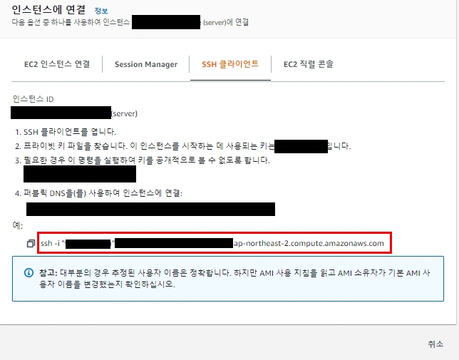 2. SSH 클라이언트칸으로 들어가 빨간박스 안에 있는 부분에서 (user name)@ec2~~ 부분을 숙지해둡니다.