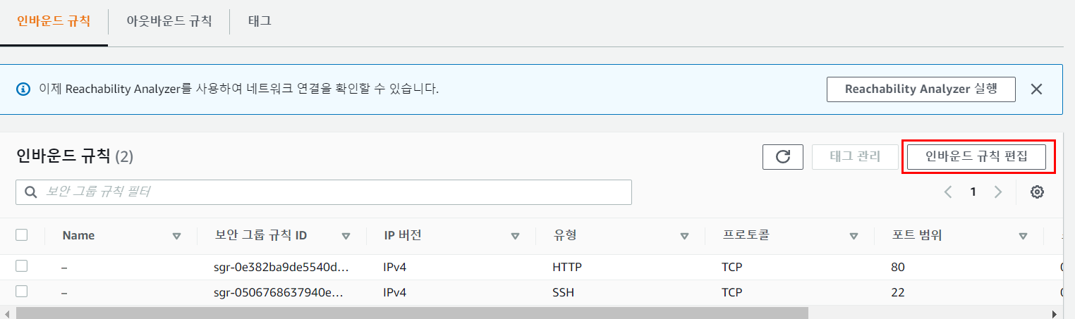 9. 아래와 같이 규칙을 편집하고 저장한뒤 다시 퍼블릭 IP를 주소창에 입력하면 정상적으로 작동됩니다.