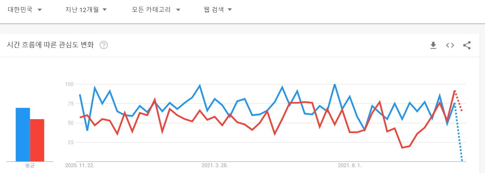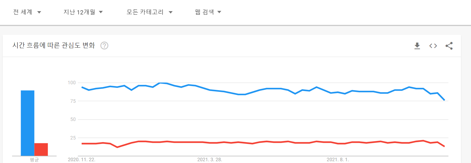 먼저 사용량을 보기위해 구글 트렌스에서 단순하게 Apache와 NginX의 검색량을 찾아봤습니다.