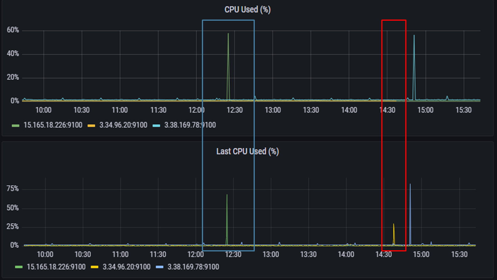 파랑색 박스는 그 전날과 비슷한 시간에 똑같이 CPU의 사용률이 올랐기에 Alert를 발생하지 않고