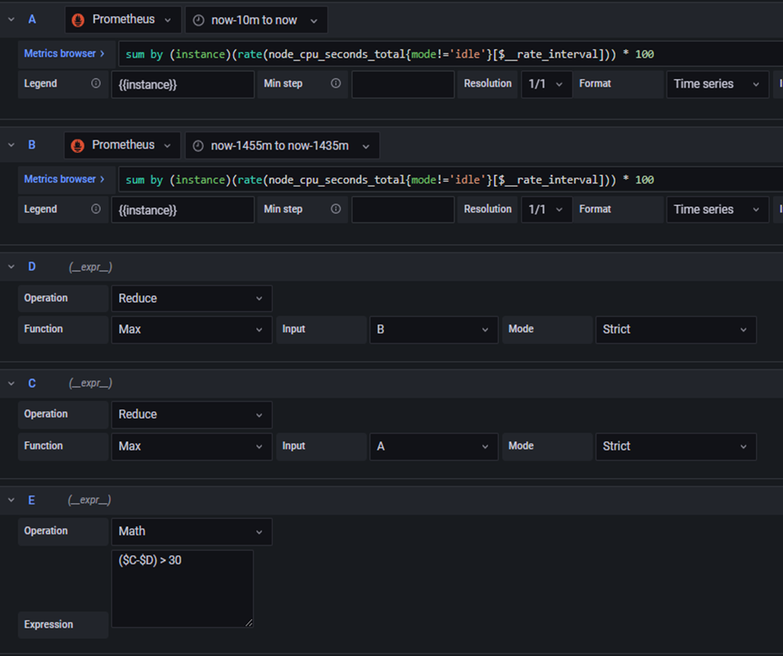 위의 A와 B쿼리는 Node-exporter에서 CPU 사용률을 가져오는 쿼리이며